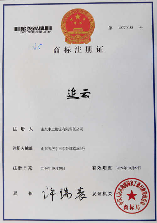 近日,山东中煤集团旗下子公司山东中运物流有限责任公司成功取得“追云”商标注册证书。证书由国家工商行政管理总局颁发,是公司信誉和质量的象征,对维护集公司的合法权益具有重要意义。
